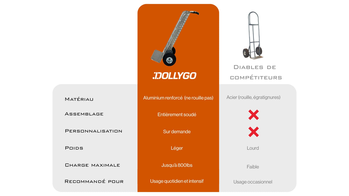 La compétition ne fait pas le poids avec nous. Nos diables sont entièrement soudés en aluminium renforcé au Québec. Légers et maniables, ils sont bâtis pour durer et affronter les rythmes les plus exigeants de l'industrie.
