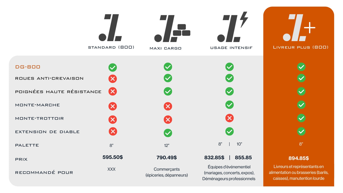 La compétition ne fait pas le poids avec nous. Nos diables sont entièrement soudés au Québec en aluminium renforcé. Légers et maniables, ils sont bâtis pour durer et affronter les rythmes les plus exigeants de l'industrie.
